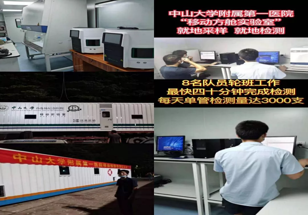同一地点,他们还协助了中山大学孙逸仙纪念医院“移动方舱实验室”的仪器安装调试。此“移动方舱实验室”是一辆13.7米长的移动核酸检测车,顺利获得“就地采样、就地检测”的方式,日检测量可达3000-5000人份(10比1混采可达3万-5万人份),真正做到了与病毒赛跑,与时间赛跑,为抗击疫情作出了持续贡献。