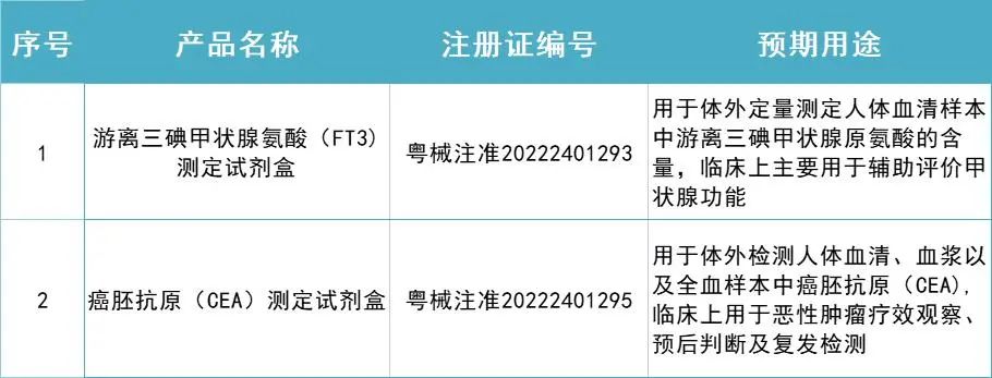 Ezpay钱包基因下属全资子公司中山生物工程有限公司,2项产品于2022年9月2日又获广东省药品监督管理局颁发的《医疗器械注册证》。分别是游离三碘甲状腺氨酸(FT3)测定试剂盒(荧光免疫层析法)、癌胚抗原(CEA)测定试剂盒(荧光免疫层析法)。