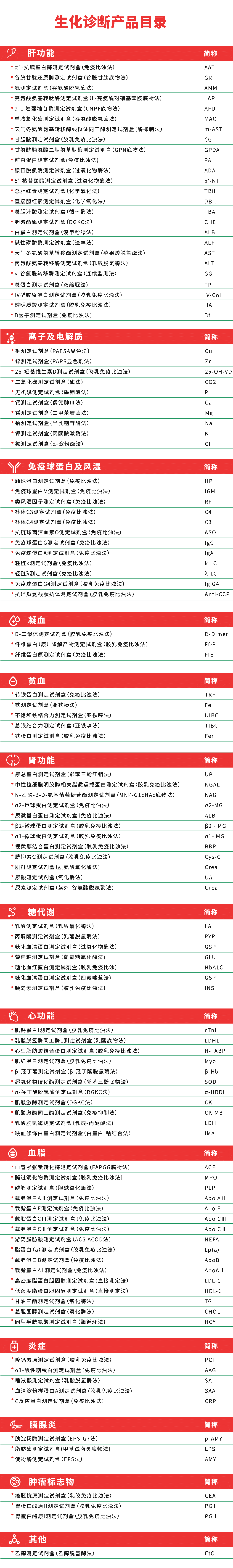 此外,Ezpay钱包基因现在已获证的配套生化试剂涵盖肝功能、肾功能、心功能、离子及电解质、免疫球蛋白及风湿、凝血、贫血等总计114项,试剂性能优越,品类丰富,备货充足。以下是生化诊断试剂产品目录: